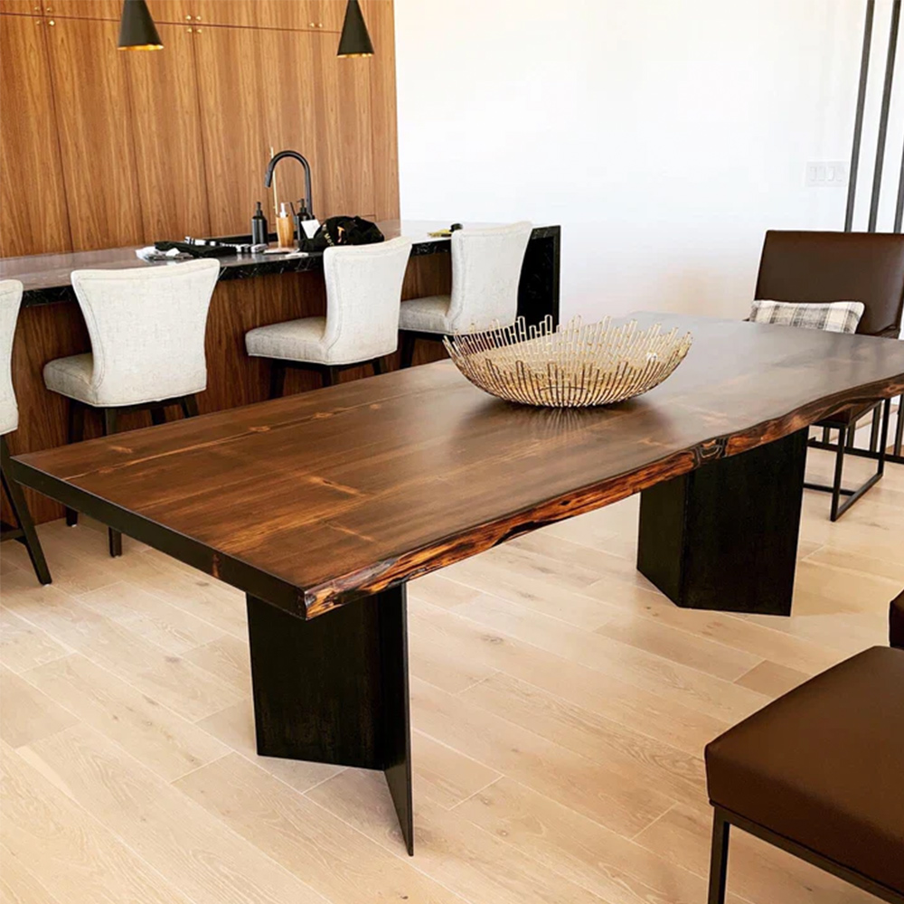 The tabletop of our live edge table is usually crafted from American black walnut, showcasing its captivating natural beauty. Alternatively, we offer tabletop options in white oak, cedar, and exotic woods for those who desire a different wood species. Instead of conforming the wood into a strict rectangular shape, we embrace and preserve the natural contours and edges of the material, allowing the piece to exude a distinctive and organic ambiance.