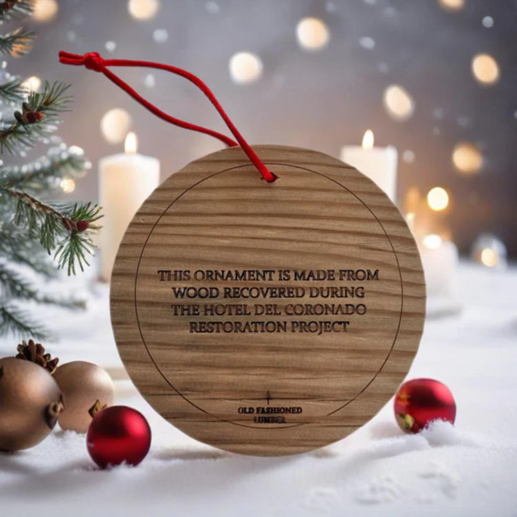 This ornament is made from wood recovered during the Hotel Del Coronado restoration project